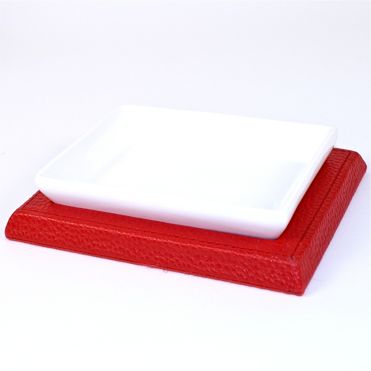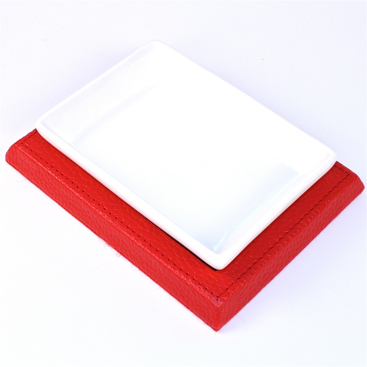 | Short Description: | Decorative rectangle faux leather soap holder with pottery container. Available with a red finish. |