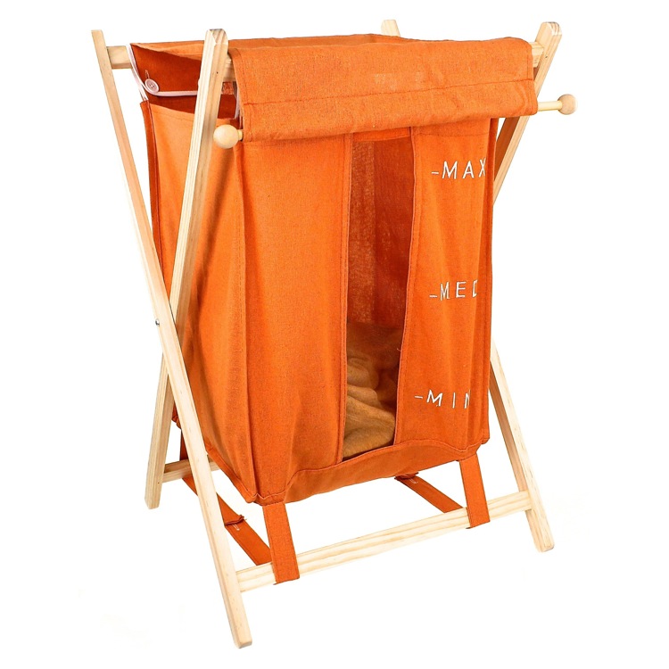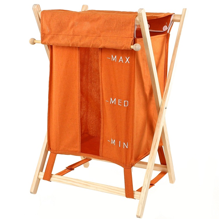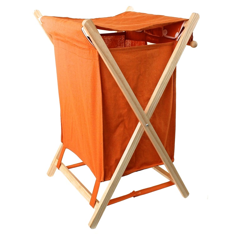 Short Description: | Square orange laundry basket made out of wood and cotton-polyester. |