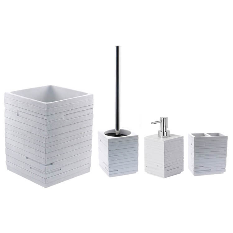 | Short Description: | Stylish, decorative white bathroom accessory set which includes toilet brush holder, waste can, toothbrush holder, and soap dispenser. |