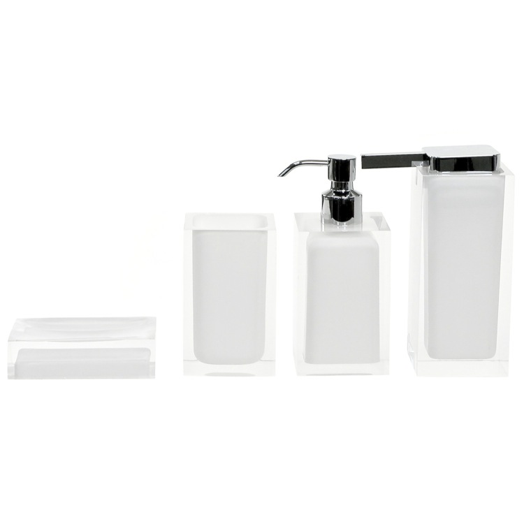 Short Description: | Beautiful white accessory set with included large soap dispenser, small soap dispenser, toothbrush holder, and a soap dish. From the Gedy Rainbow Collection. |