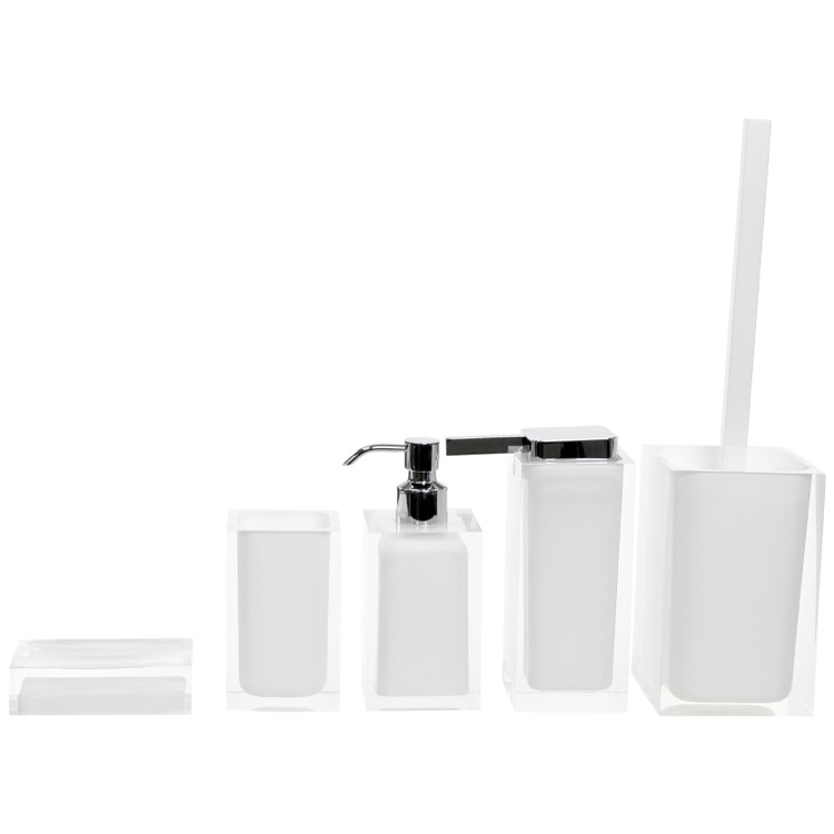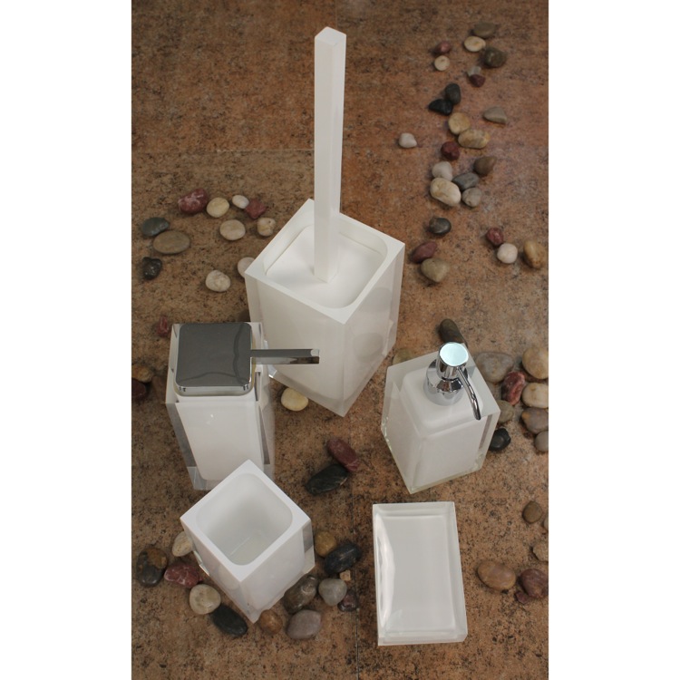 Short Description: | Fancy white accessory set with included large soap dispenser, small soap dispenser, toothbrush holder, toilet brush holder, and a soap dish. From the Gedy Rainbow Collection. |