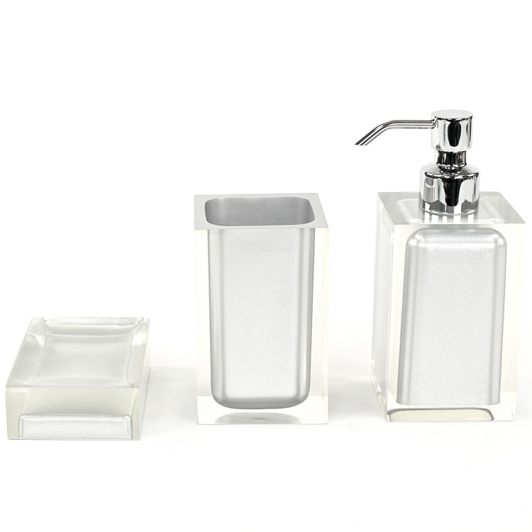Short Description: | Fancy silver finish accessory set with included soap dispenser, toothbrush holder, and a soap dish. From the Gedy Rainbow Collection. |