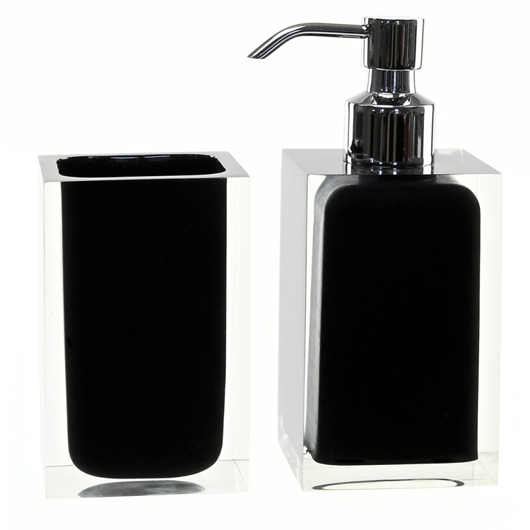 Short Description: | Two piece black accessory set from the Rainbow collection by Gedy. Bathroom accessory includes 2 pieces: soap dispenser and toothbrush tumbler. All products are made of thermoplastic resin and finished in black. |