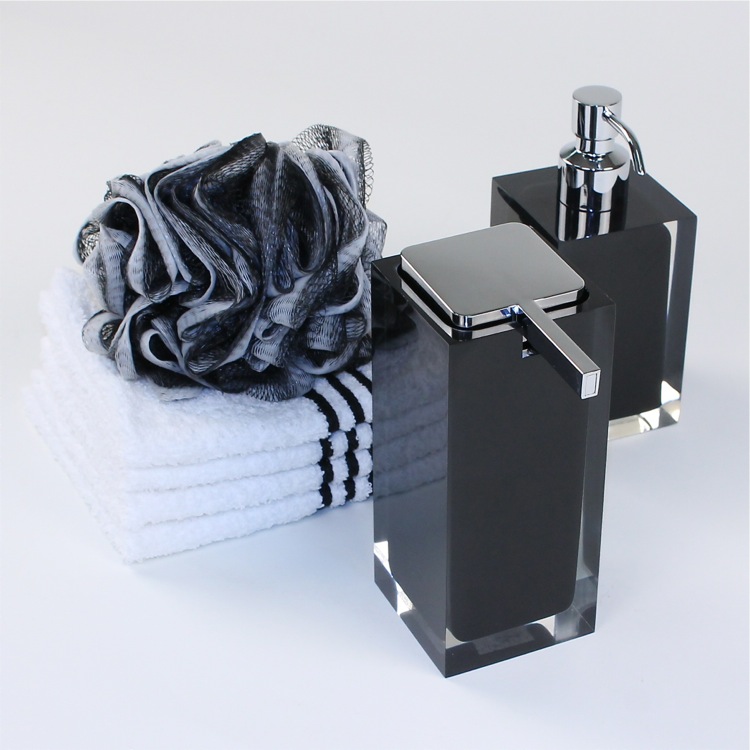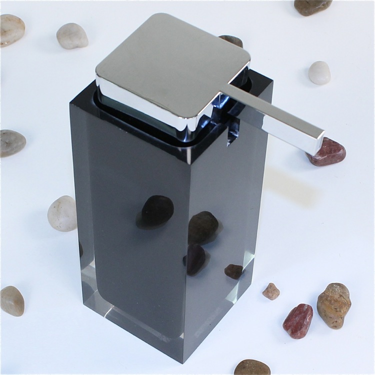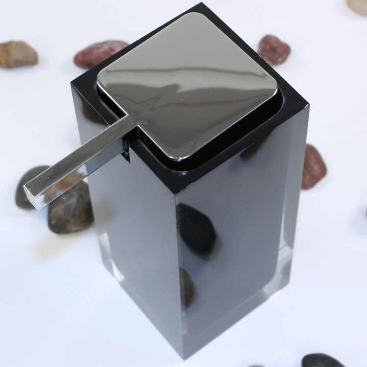 | Short Description: | Modern, decorative square semi-transparent hand soap dispenser with polished chromed plastic hand pump. Soap dispenser container made from thermoplastic resins. Gel dispenser in black finish. |