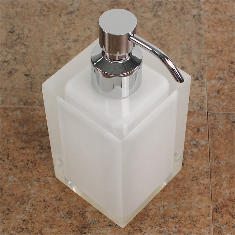 | Short Description: | Modern, decorative square semi-transparent white hand soap dispenser with chrome finish hand pump. Soap dispenser container made from thermoplastic resins. |