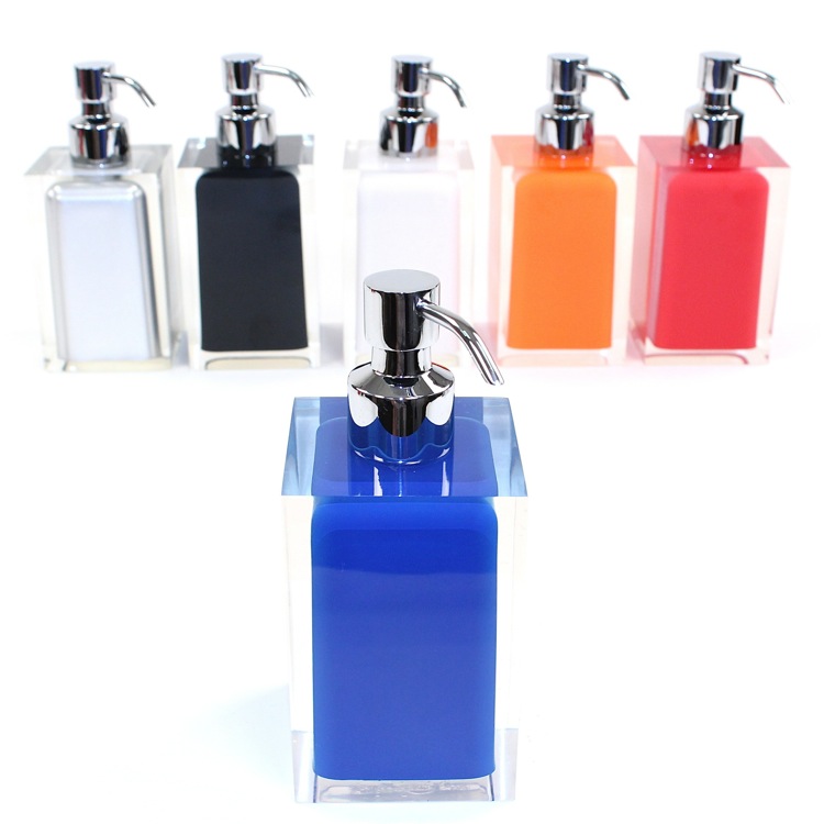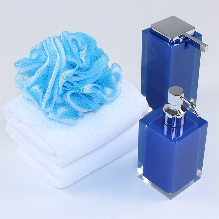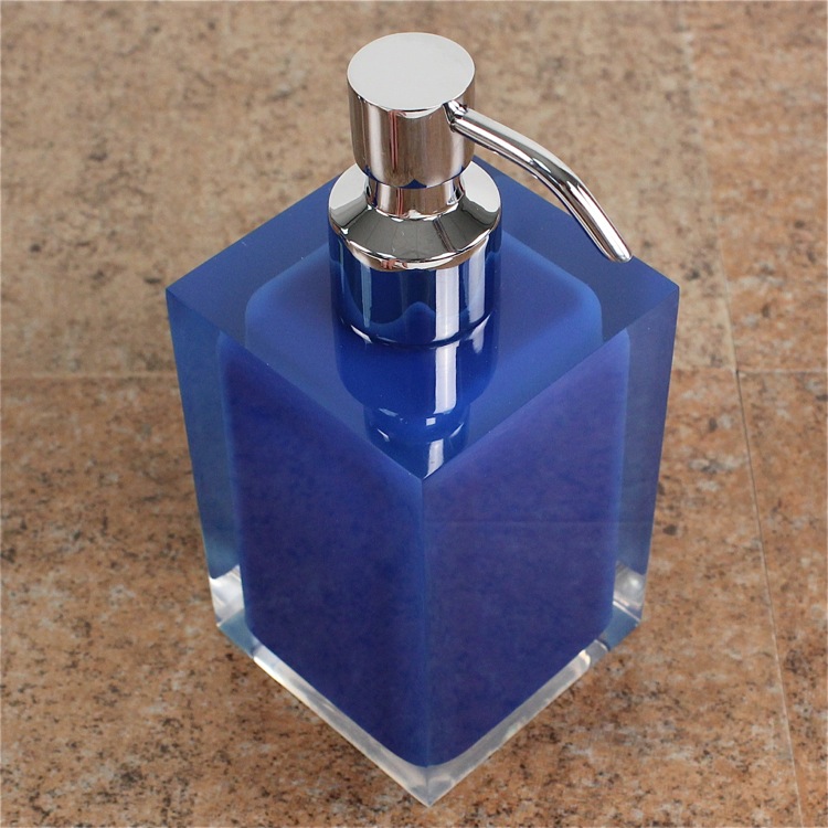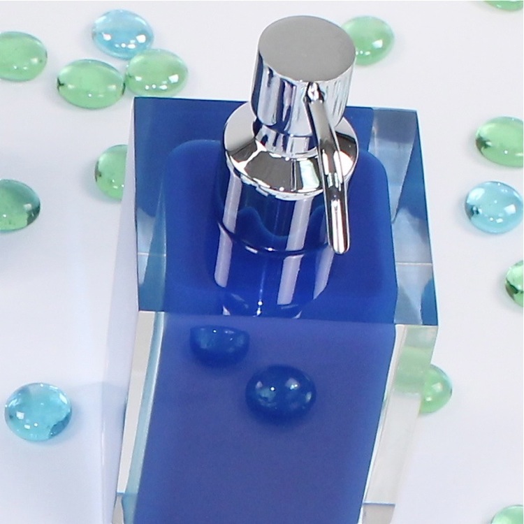 Short Description: | Modern, decorative square semi-transparent blue hand soap dispenser with chrome finish hand pump. Soap dispenser container made from thermoplastic resins. |