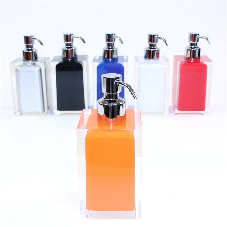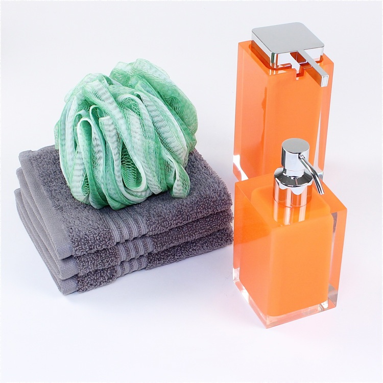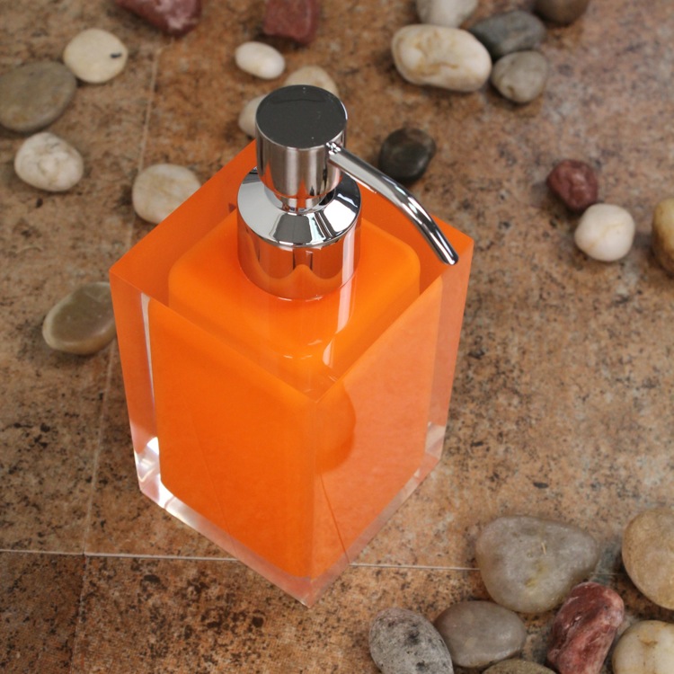 | Short Description: | Modern, decorative square semi-transparent orange hand soap dispenser with chrome finish hand pump. Soap dispenser container made from thermoplastic resins. |