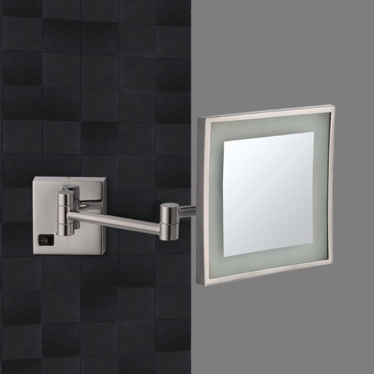 | Short Description: | Wall mounted, adjustable, 3x magnification makeup mirror made of brass. Available in a satin nickel finish, this square single faced mirror features a built-in LED light. |