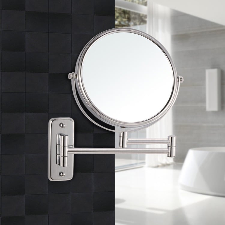 | Short Description: | Extendable round wall mounted makeup mirror made of brass available in satin nickel. Double faced mirror featuring 3x magnification. |