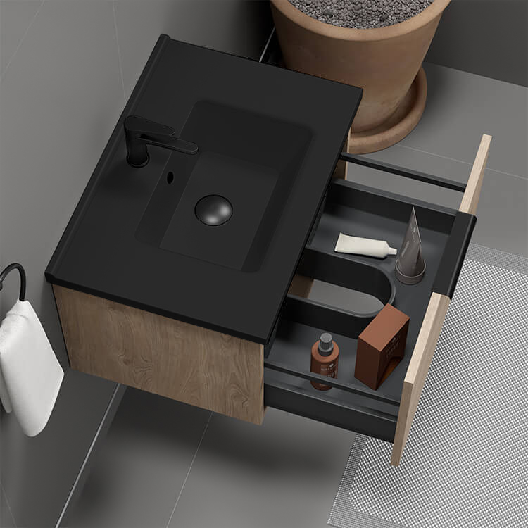 24 Inch Wall Mount Brown Oak Bathroom Vanity Cabinet With Black Handle.