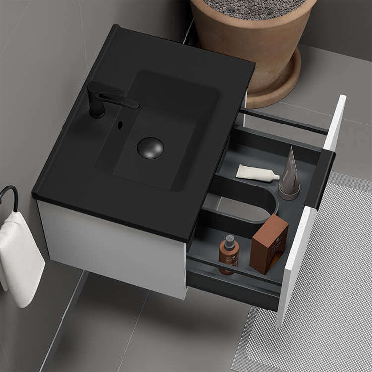 24 Inch Wall Mount Glossy White Bathroom Vanity Cabinet With Black Handle.
