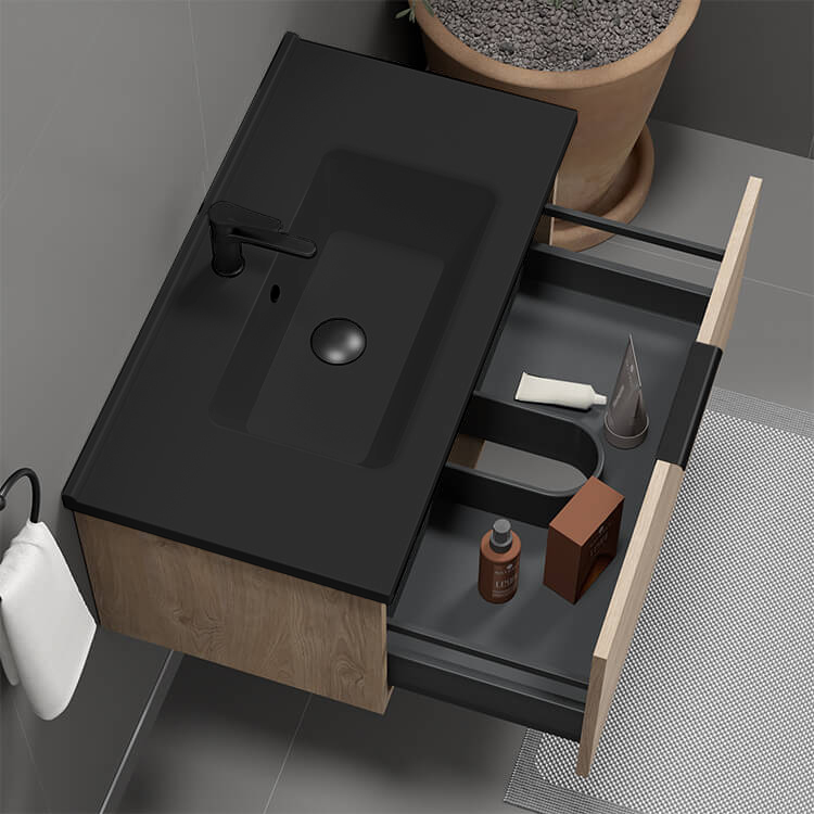 32 Inch Wall Mount Brown Oak Bathroom Vanity Cabinet With Black Handle.