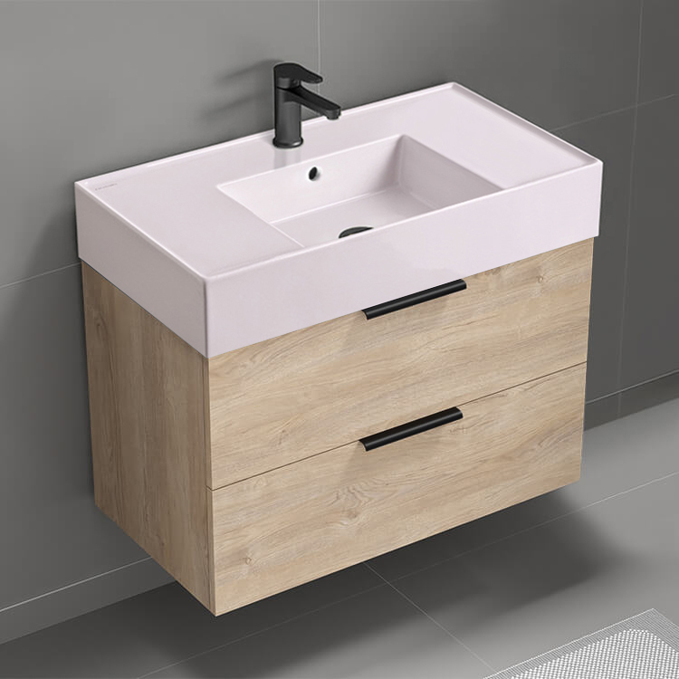 32 Inch Wall Mount Brown Oak Bathroom Vanity Cabinet With Black Handles.