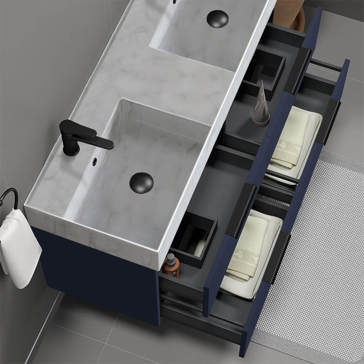 47 Inch Wall Mount Navy Blue Bathroom Vanity Cabinet With Black Handles.