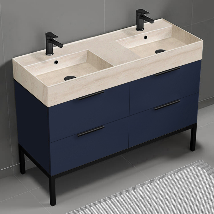 | Product Name: | Modern Double Bathroom Vanity, Blue, 48", Travertine Style Sink, Free Standing |
