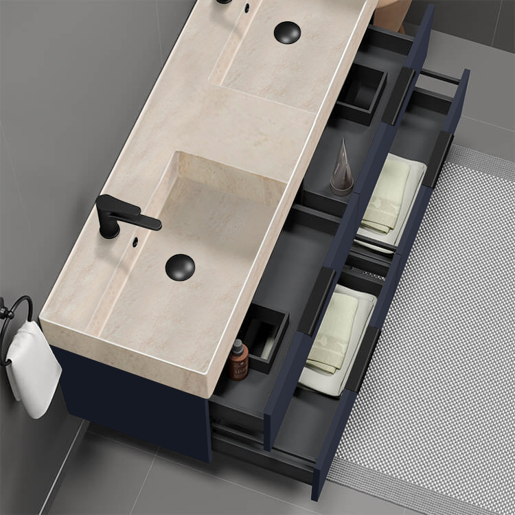 | Product Name: | Double Floating Bathroom Vanity, Modern, Blue, 56", Travertine Style Sink |