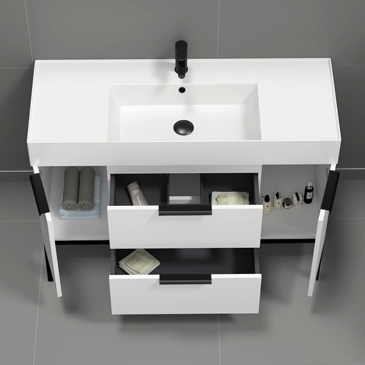 47 Inch Wall Mount Glossy White Bathroom Vanity Cabinet With Black Handles.