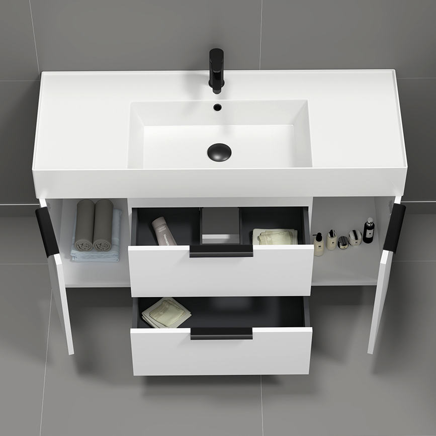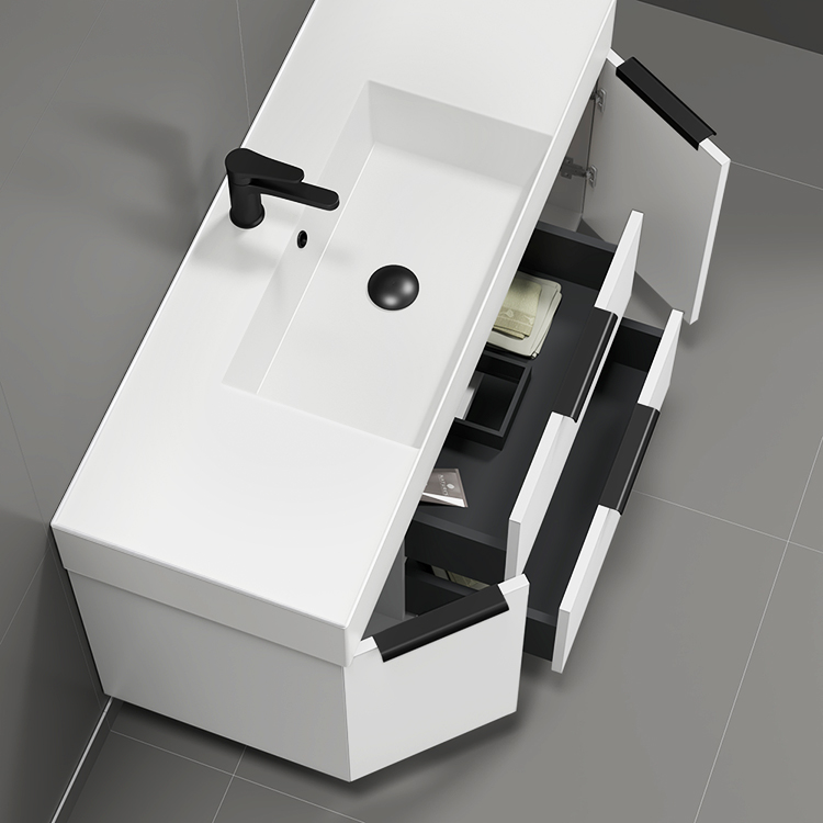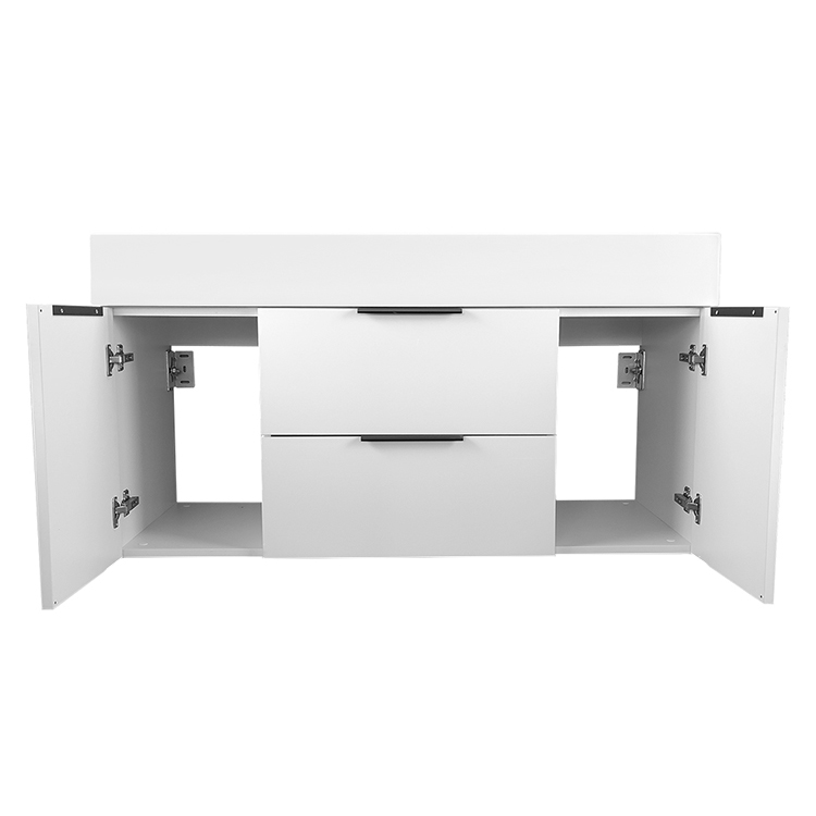 47 Inch Wall Mount Glossy White Bathroom Vanity Cabinet With Black Handles.
