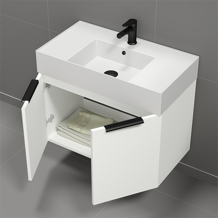 32 Inch Wall Mount Glossy White Bathroom Vanity Cabinet With Black Handles.