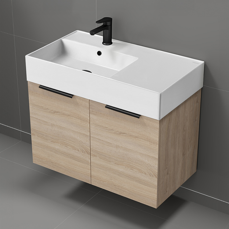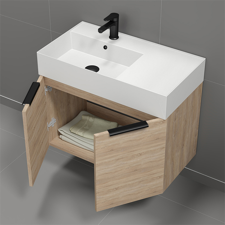 32 Inch Wall Mount Brown Oak Bathroom Vanity Cabinet With Black Handles.
