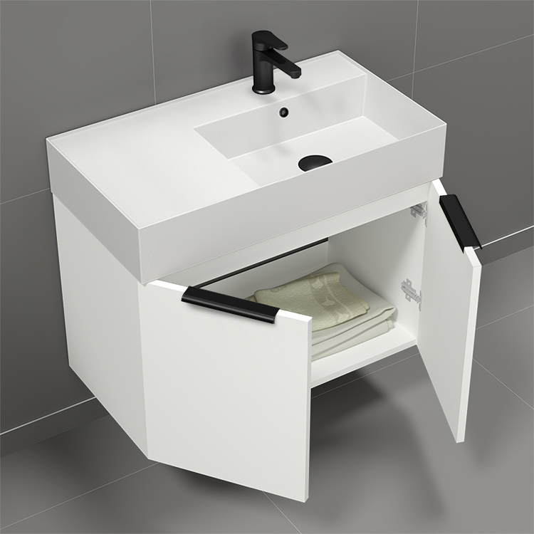 32 Inch Wall Mount Glossy White Bathroom Vanity Cabinet With Black Handles.