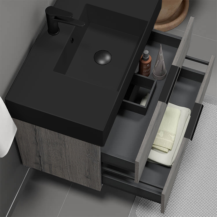32 Inch Wall Mount Grey Oak Bathroom Vanity Cabinet With Black Handles.