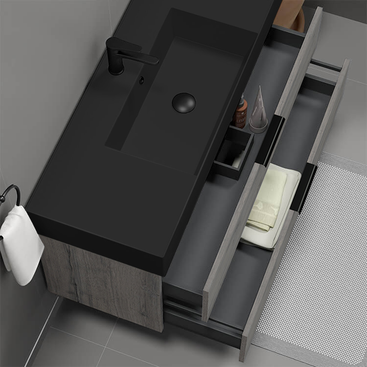 47 Inch Wall Mount Grey Oak Bathroom Vanity Cabinet With Black Handles.