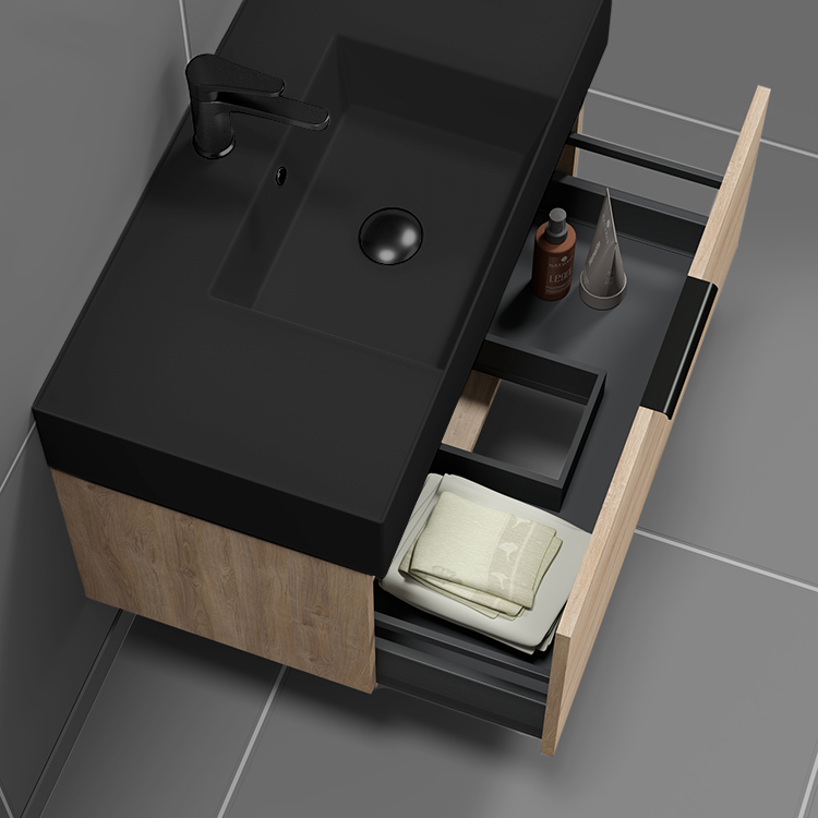 32 Inch Wall Mount Brown Oak Bathroom Vanity Cabinet With Black Handles.