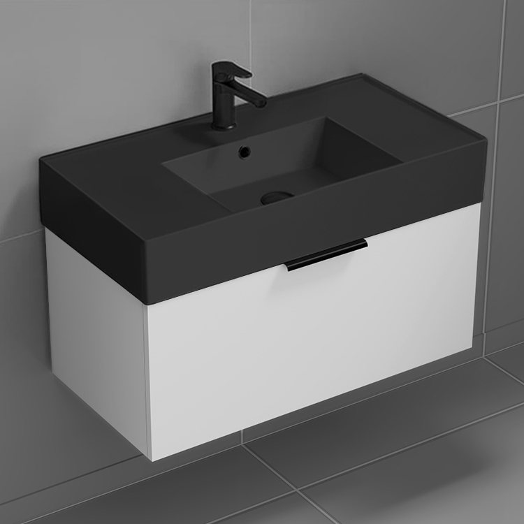 32 Inch Wall Mount Glossy White Bathroom Vanity Cabinet With Black Handles.