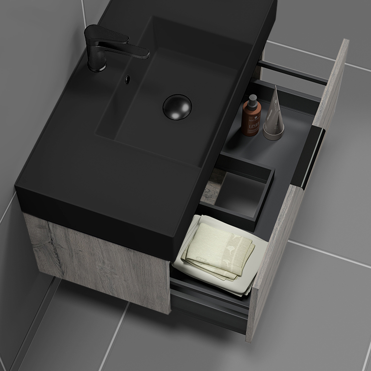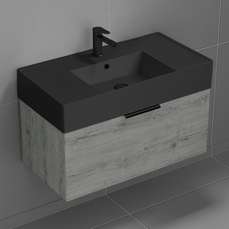 32 Inch Wall Mount Grey Oak Bathroom Vanity Cabinet With Black Handles.