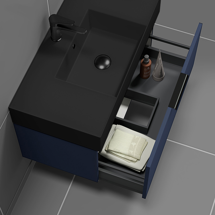 32 Inch Wall Mount Navy Blue Bathroom Vanity Cabinet With Black Handles.