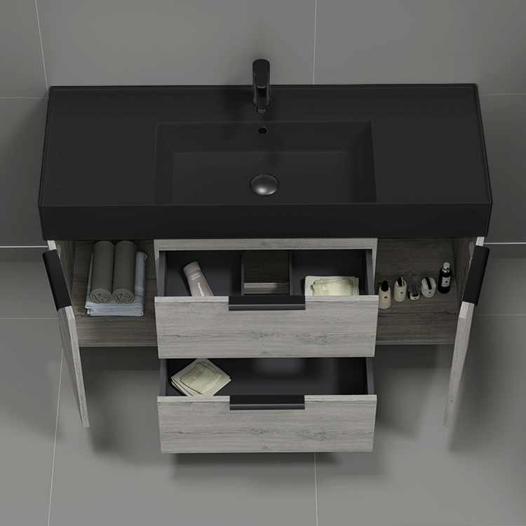 47 Inch Wall Mount Grey Oak Bathroom Vanity Cabinet With Black Handles.