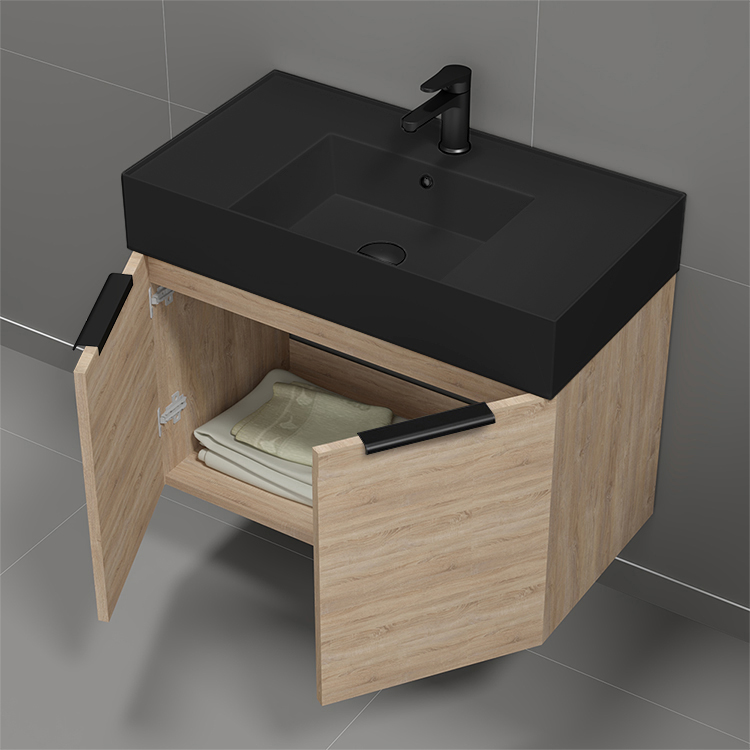 32 Inch Wall Mount Brown Oak Bathroom Vanity Cabinet With Black Handles.