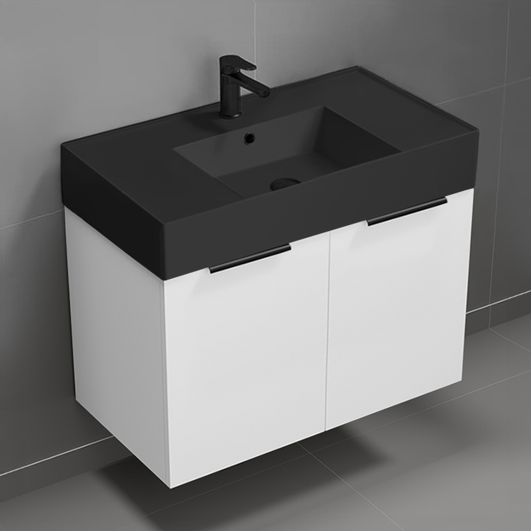 32 Inch Wall Mount Glossy White Bathroom Vanity Cabinet With Black Handles.