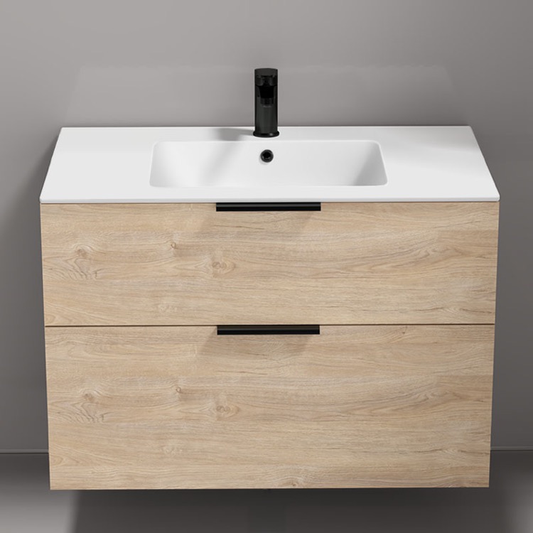 35" Wall Mount Brown Oak Vanity Cabinet With Black Handles.