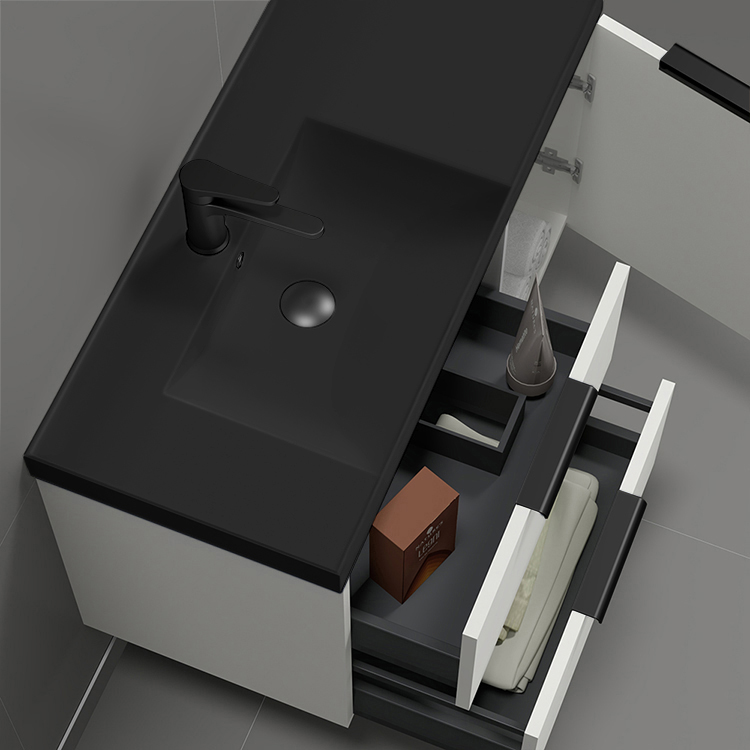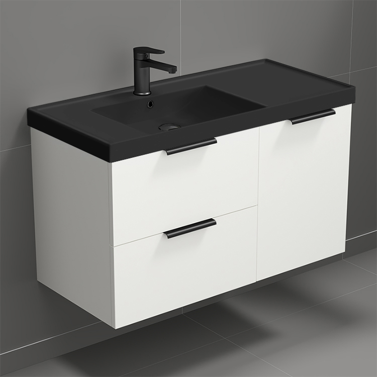 35 Inch Wall Mount Glossy White Bathroom Vanity Cabinet With Black Handles.