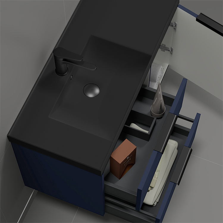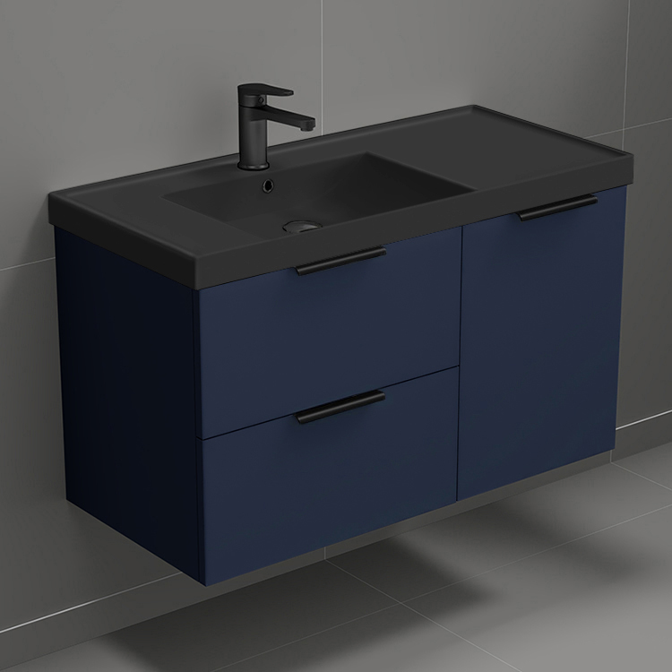 35 Inch Wall Mount Navy Blue Bathroom Vanity Cabinet With Black Handles.