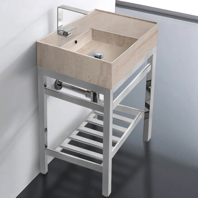 | Short Description: | Made from high quality beige travertine design ceramic and stainless steel in a polished chrome finish, this console bathroom sink set is a perfect choice for your bathroom. Featuring right side sink counter space as well as a lower towel rack with more usable space, this solution is perfect to keep your bathroom always tidy. |