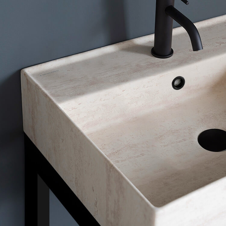 | Short Description: | Made from high quality beige travertine design ceramic and stainless steel in a matte black finish, this console bathroom sink set is a perfect choice for your bathroom. Featuring right side sink counter space as well as a lower towel rack with more usable space, this solution is perfect to keep your bathroom always tidy. |