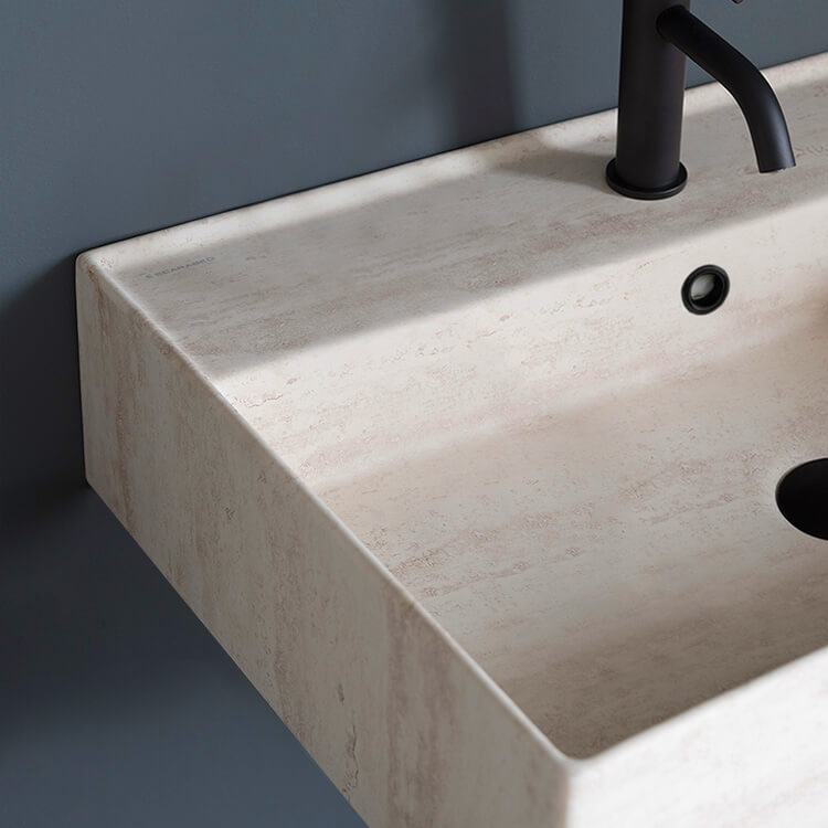Beige Travertine Design Ceramic Wall Mounted or Vessel Double Sink With Counter Space.
