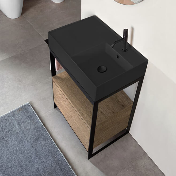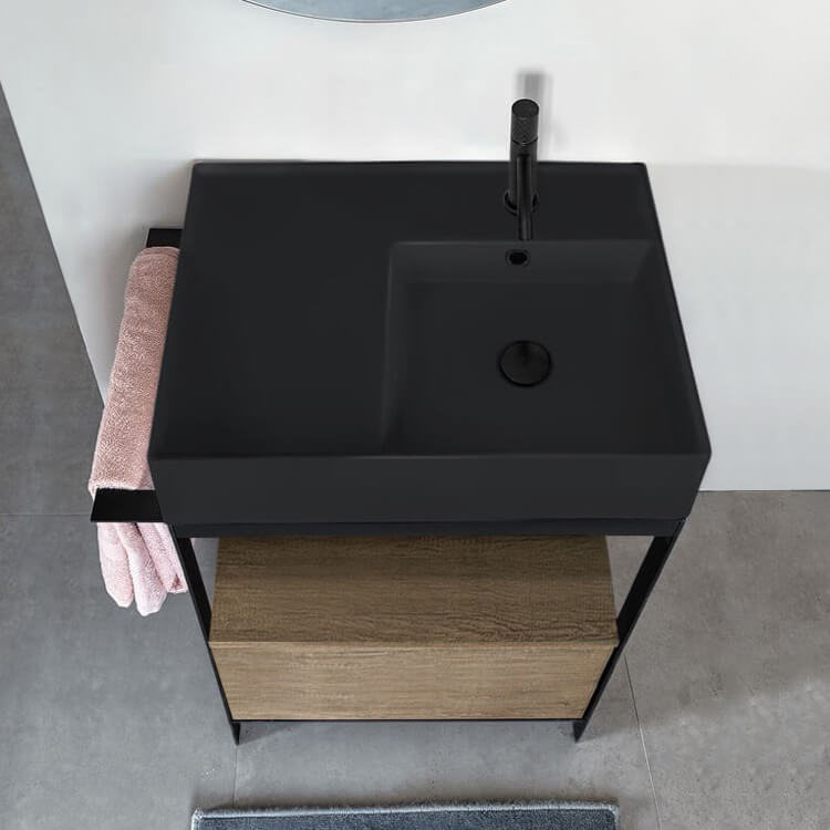 Black Ceramic Wall Mounted or Vessel Sink With Counter Space.