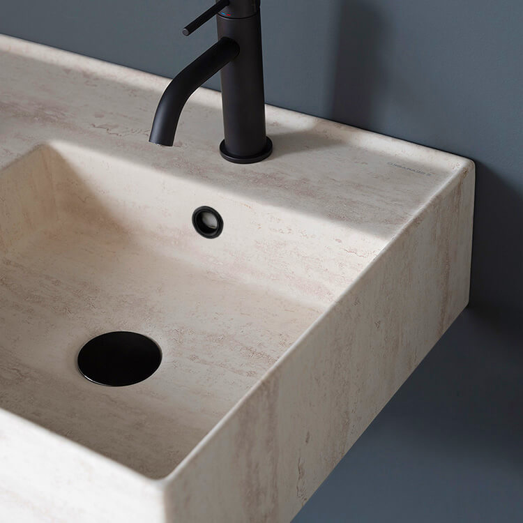 Beige Travertine Design Ceramic Wall Mounted or Vessel Sink With Counter Space.