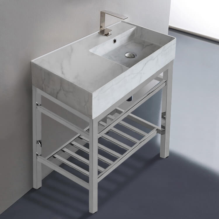 Short Description: | Made from high quality white marble design ceramic and stainless steel in a polished chrome finish, this console bathroom sink set is a perfect choice for your bathroom. Featuring left side sink counter space as well as a lower towel rack with more usable space, this solution is perfect to keep your bathroom always tidy. |