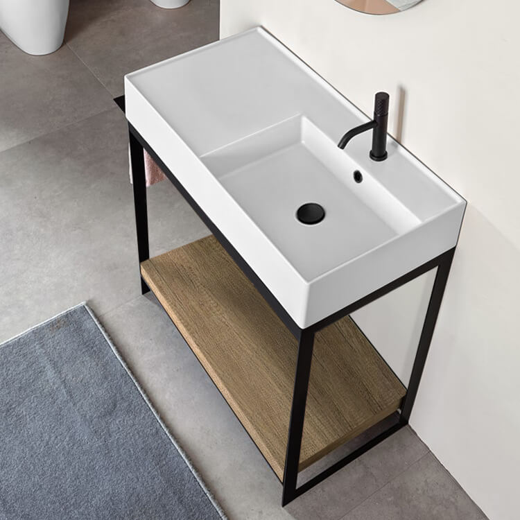 Rectangular Ceramic Wall Mounted or Vessel Sink With Counter Space.