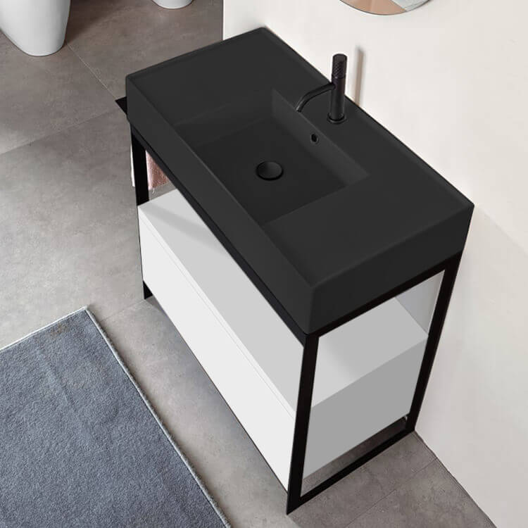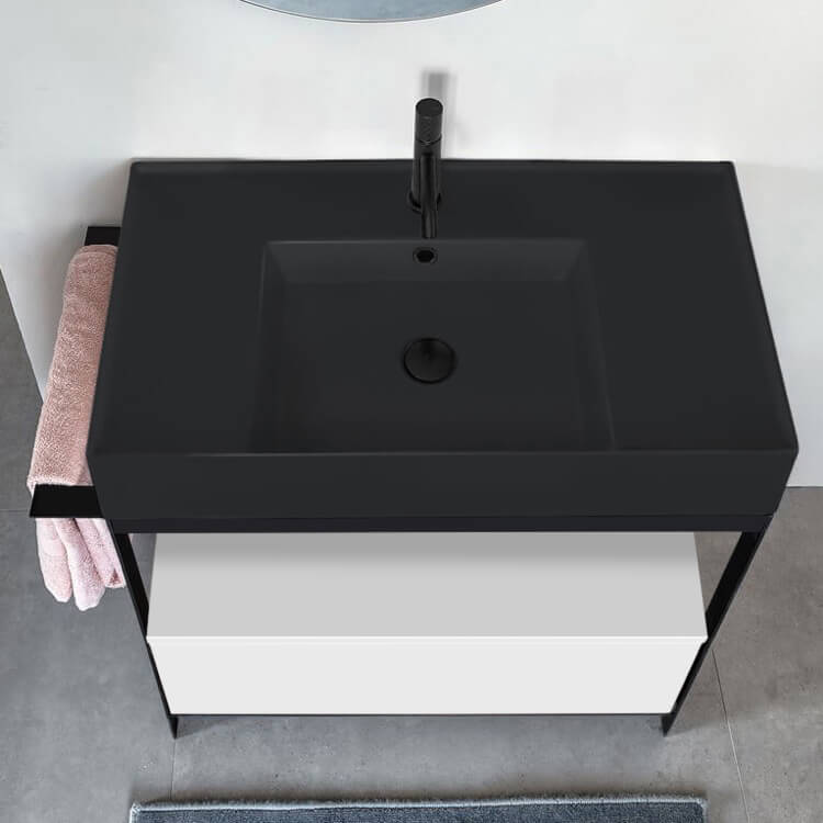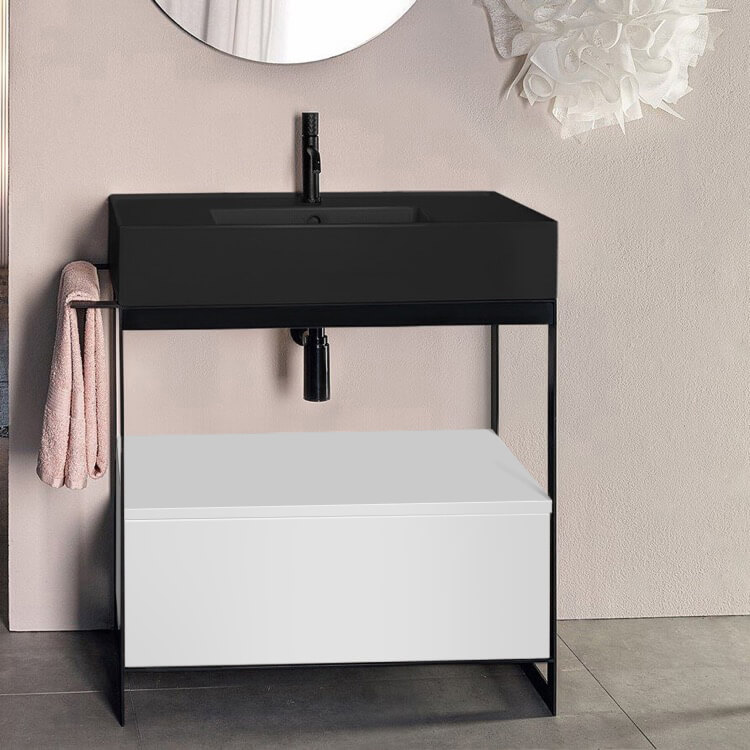 Black Ceramic Wall Mounted or Vessel Sink With Counter Space.