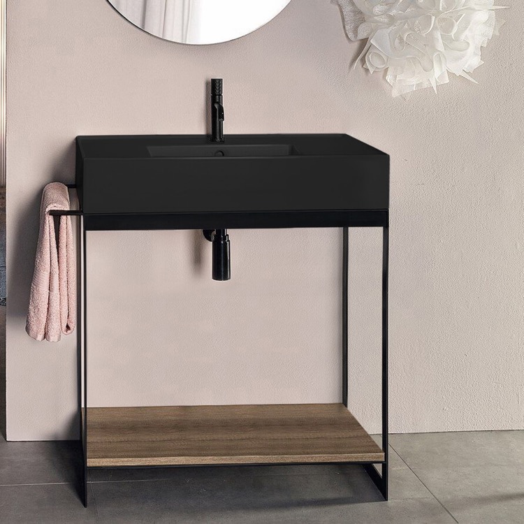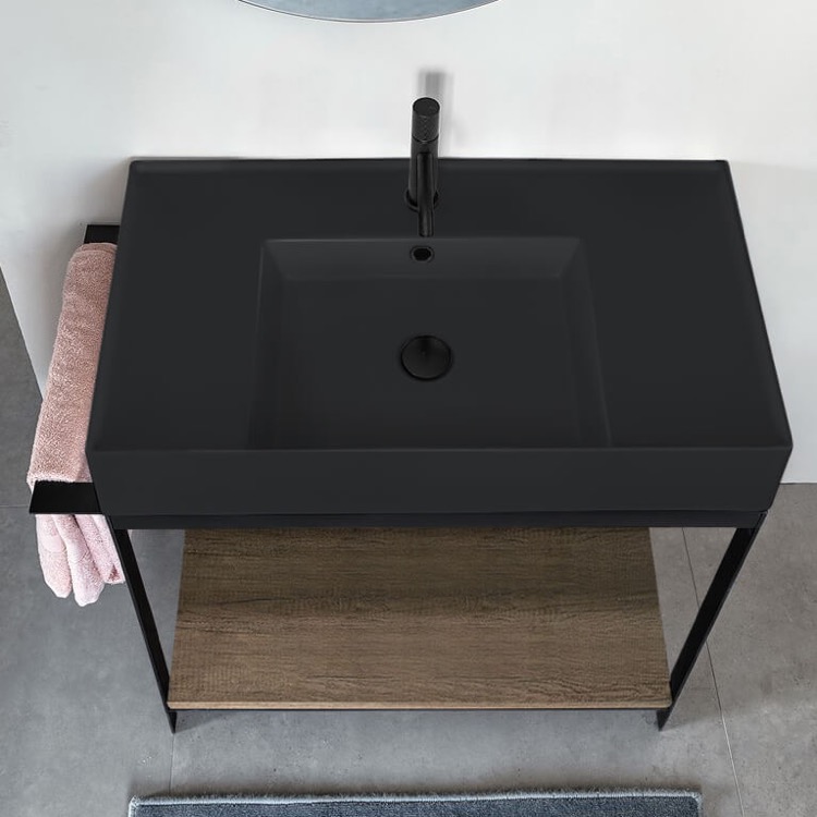 Black Ceramic Wall Mounted or Vessel Sink With Counter Space.