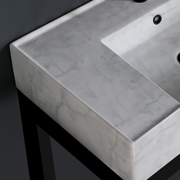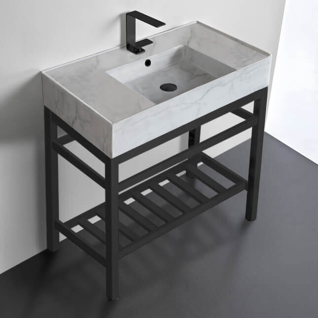 Short Description: | Made from high quality ceramic in a white marble design finish and stainless steel in a matte black finish, this modern console bathroom sink set is a perfect choice for your bathroom. Featuring counter space on both sides of the basin as well as a lower towel rack with more usable space, this solution is perfect to keep your bathroom always tidy. |