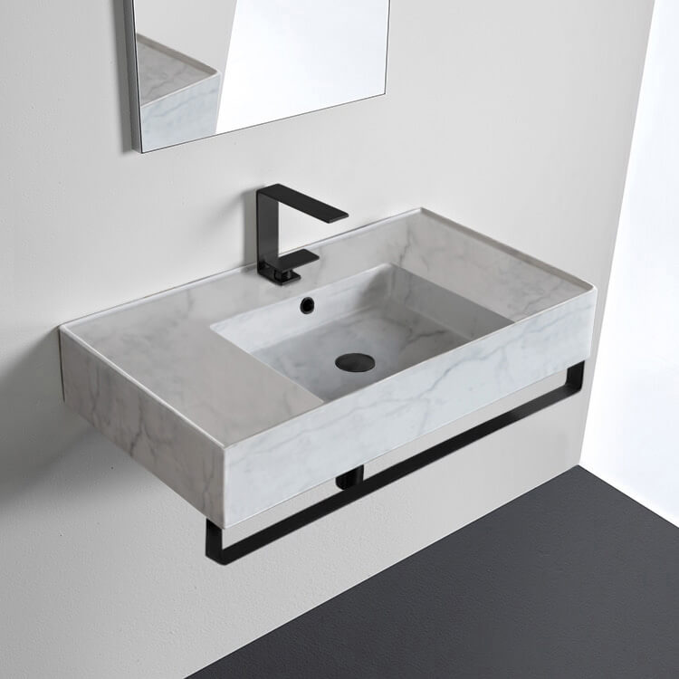 | Product Name: | Marble Design Ceramic Wall Mounted Sink With Black Towel Bar |