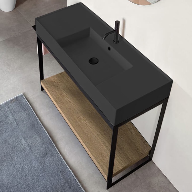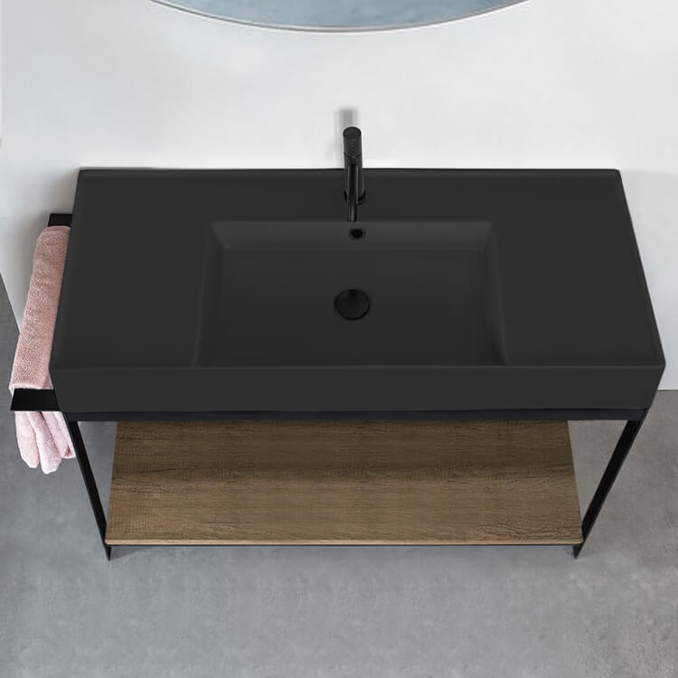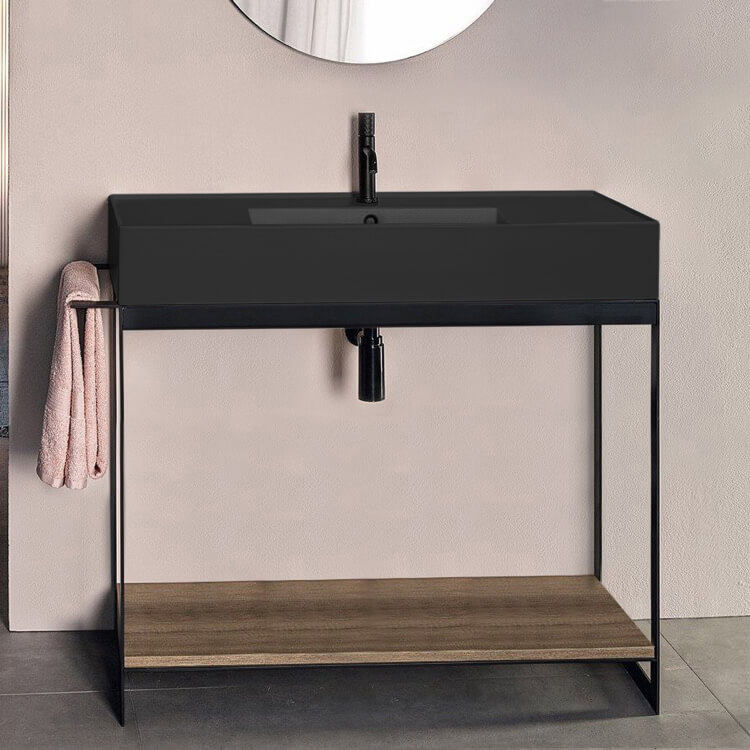 Black Ceramic Wall Mounted or Vessel Sink With Counter Space.