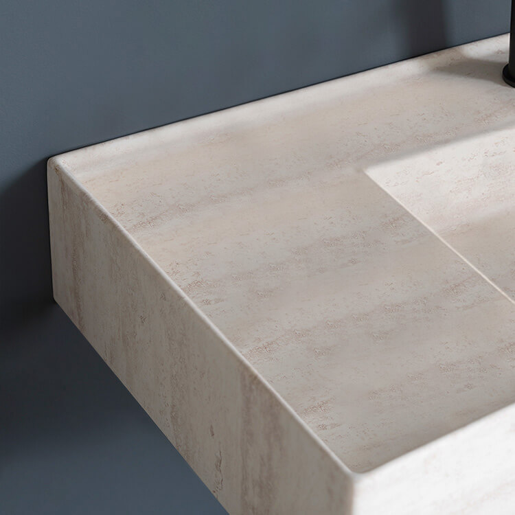 Beige Travertine Design Ceramic Wall Mounted or Vessel Sink With Counter Space.
